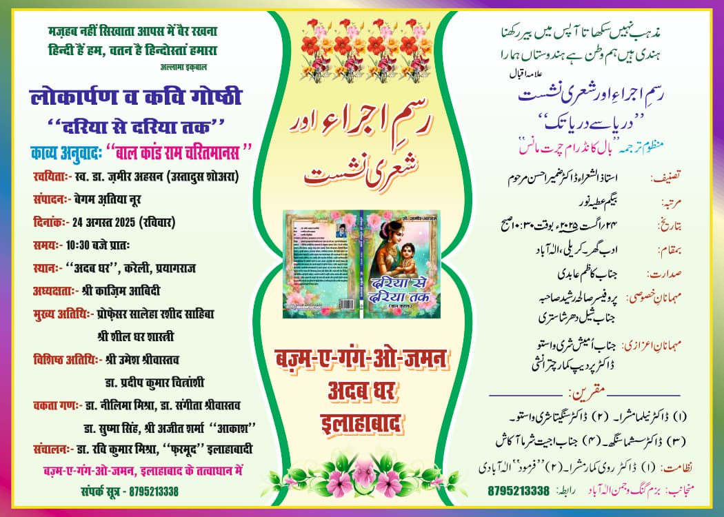 پریاگ راج (نامہ نگار): الہ آباد استاذ الشعراء ڈاکٹر ضمیر احسن مرحوم کی تصنیف ”دریا سے دریا تک“ منضوم ترجمہ بال کانڈ رام چرت مانس کی رسم اجراء آئندہ ۴۲/ اگست کو صبح ۰۳:۰۱/ بجے ادب گھر کریلی میں منعقد ہوگی۔ جس کی صدارت معروف ادیب کاظم عابدی کریں گے اور مہمان خصوصی پروفیسر صالحہ رشید و شیل دھر شاستری ہوں گے۔اس موقع پر ڈاکٹر ضمیر احسن مرحوم کی شخصیت اور فن تقاریر ہوں گی۔ اس کے علاوہ شعری نشست کا انعقاد بھی ہوگا۔ کتاب کی مرتب بیگم عطیہ نور نے بتایا کہ مرحوم ڈاکٹر ضمیر احسن نے مذہبی ہم اہنگی اور گنگا جمنی تہذیب کے فروغ کے پیش نظر بہت جا ں فشانی سے یہ کارنامہ انجام دیا تھا۔ جسے فخریہ پیش کیا جا رہا ہے۔ پروگرام کی نظامت بانی ادب گھر فرمود الہ آبادی کریں گے۔